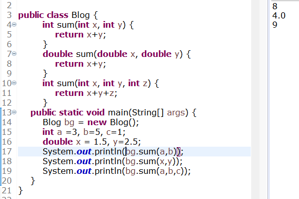 위와 같이 sum 이란 메소드명을 여러 개 선언하여 사용 하는것을 메소드 오버로딩이라 합니다.