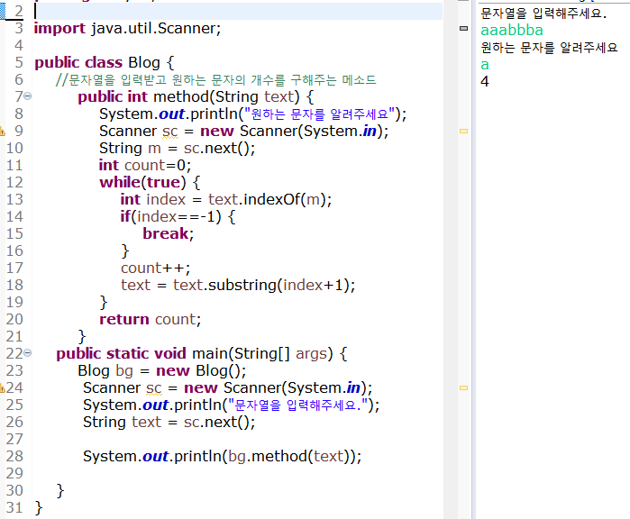 위의 예제는 문자열을 입력받고 원하는 문자의 개수를 구해주는 메소드를 작성하는 예제입니다.