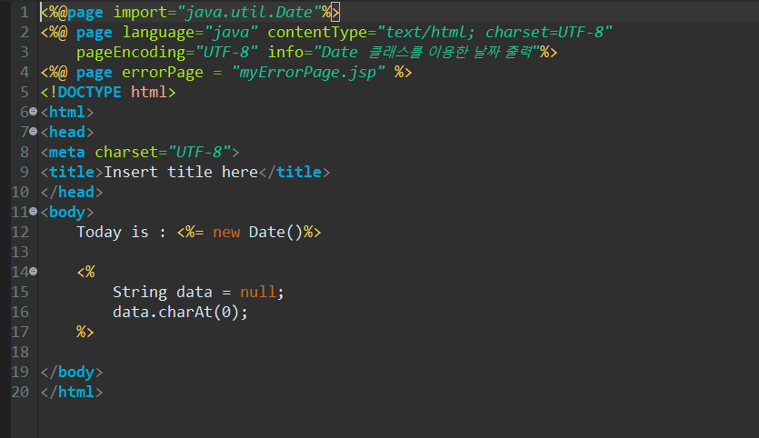 위 코드는를 보면 Date클래스를 import 해주었고, 에러가 나면 에러페이지로 이동하는 errorPage도 설정해 두었습니다.