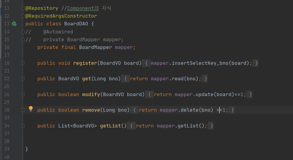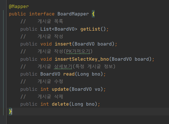 // Mapper 인터페이스는 xml의 쿼리 결과로 자동 주입 되기 때문에 Service에 있는 인터페이스와 성격과 목적이 다릅니다.