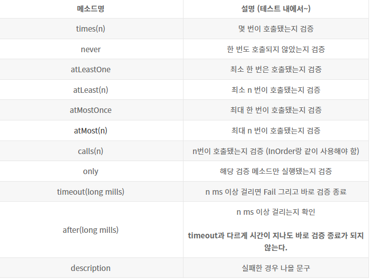 위와 같이 쓰이며 VerificationMode는 검증할 값을 정의하는 메소드이다.