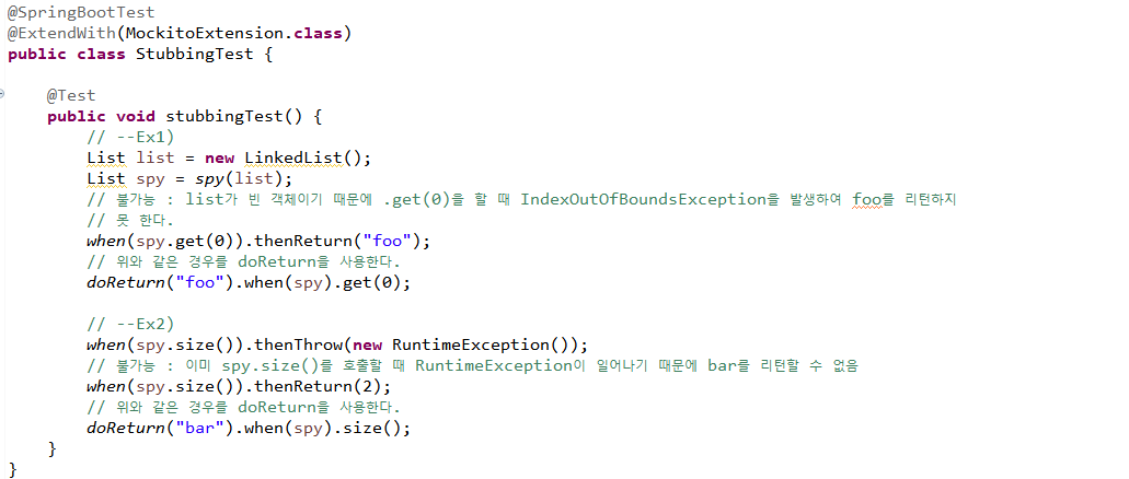@Spy로 만든 mock 객체는 진짜 객체이며 메소드 실행 시 스터빙을 하지 않으면 기존 객체의 로직을 실행한 값을, 스터빙을 한 경우엔 스터빙 값을 리턴.