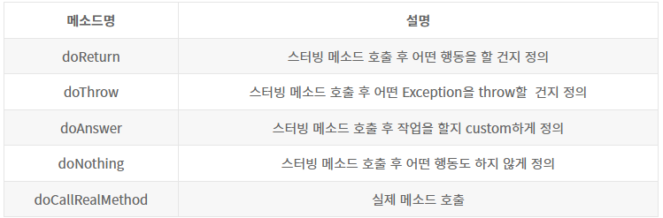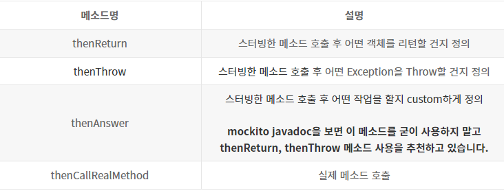 @Mock 으로 만든 mock 객체는 가짜 객체이며 그 안에 메소드 호출해서 사용하려면 반드시 스터빙(stubbing)을 해야함.