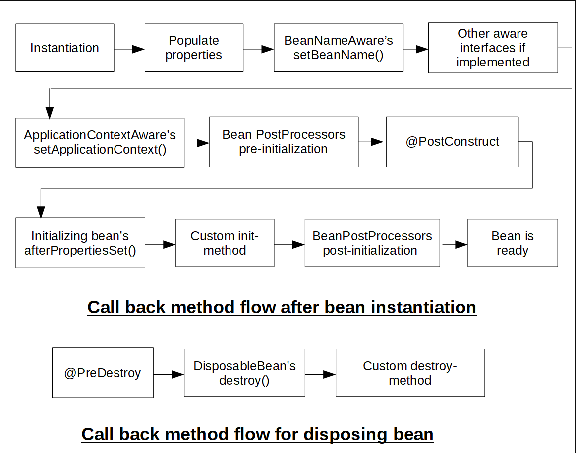 Bean에 대해 여러 라이프 사이클 메커니즘이 구성되고 각 메커니즘이 다른 메소드 이름으로 구성된 경우 구성된 각 메소드는 아래 나열된 순서대로 실행됩니다.