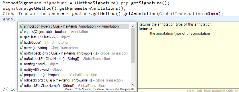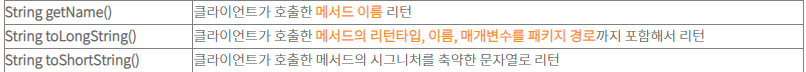 - getSignature() 메서드가 리턴하는 Signature 객체를 사용하면 호출되는 메서드에 대한 다양한 정보를 얻을 수 있는데 Signature 객체가 제공하는 메서드들은 다음과 같음