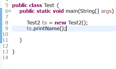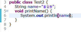 Test2클래스를 test패키지내에 만들고 default 접근제한자인 printName메소드를 선언 하였습니다.