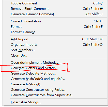 단축키 (alt+shift+s)를 누르고 Generate Gewtters and Setters를 눌러줍니다.