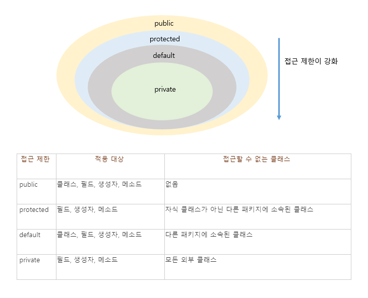 접근제한자의 종류는 public, protected, private, default(없음)으로 키워드를 나눌 수 있습니다.