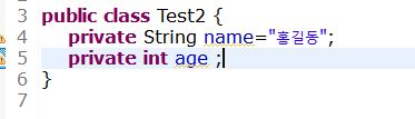 Test2클래스에서 필드에 private 접근제한자를 붙여주면 같은 패키지에 있는 Test클래스에서도 접근이 불가합니다.