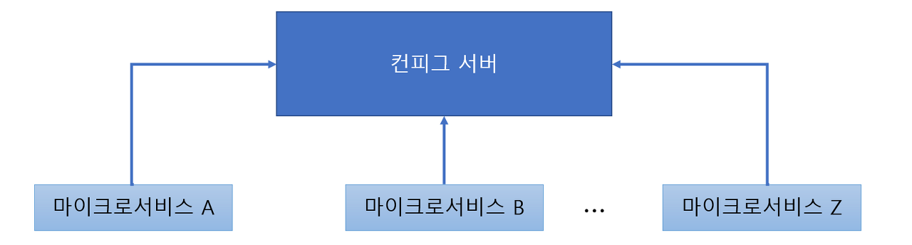 중앙 집중식 컨피그 서버는 서로 다른 모든 마이크로서비스에 속한 모든 구성을 보유한다.