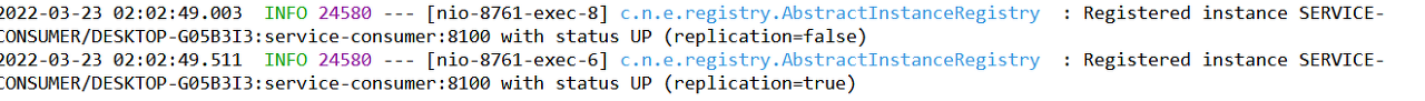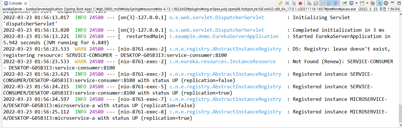 마이크로서비스A가 다시 시작되면 유레카 서버 로그에 다음 메시지가 표시된다.