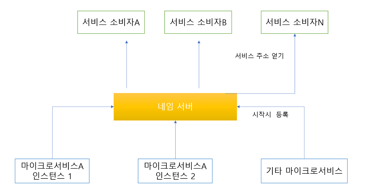 - 등록 : 모든 마이크로서비스는 각 마이크로서비스가 시작될 때 네임 서버에 자신을 등록