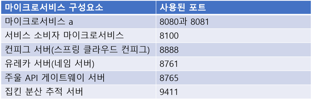 6개의 서로다른 마이크로서비스 애플리케이션과 구성요소를 만들기 위해 특정 애플리케이션에 특정 포트를 사용.