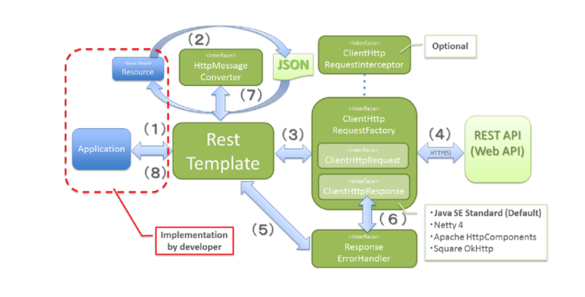 어플리케이션이 RestTemplate를 생성하고 URI, HTTP 메소드 등의 헤더를 담아 요청한다.
