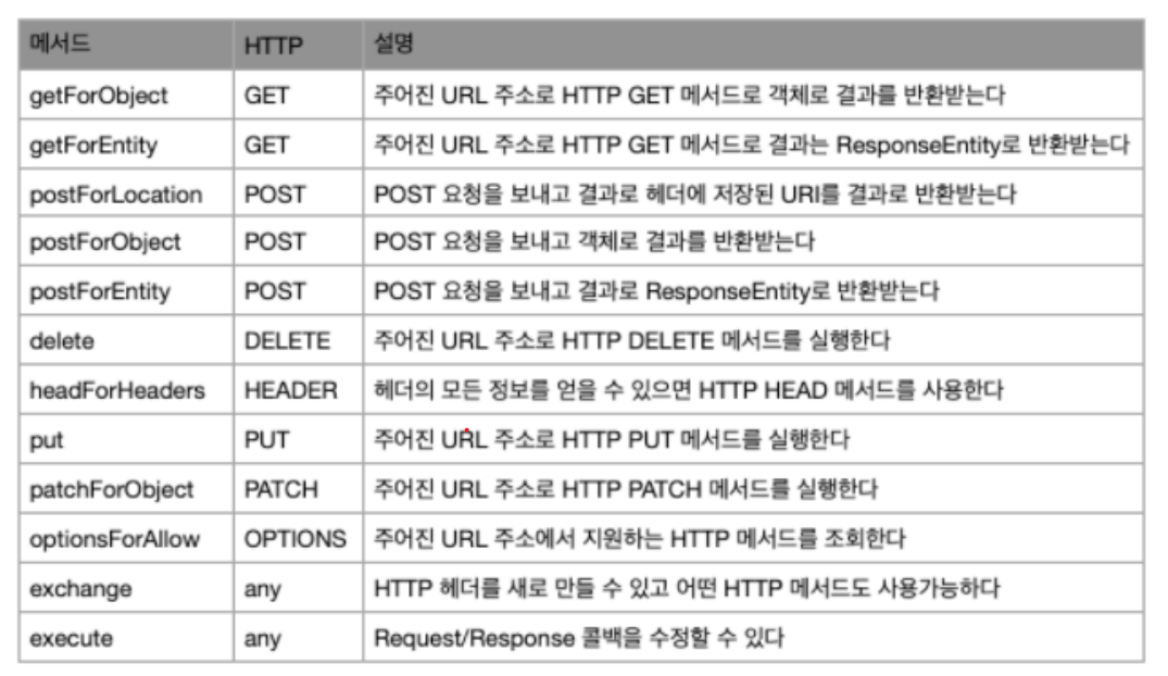 RestTemplate을 사용하기 위해서는 restTemplate.메소드명() 을 사용하면 된다.