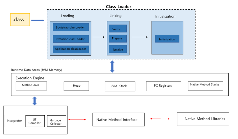 Class Loader : 런타임 시 컴파일 된 .class 파일을 메모리에 로딩하는 역할을 수행.