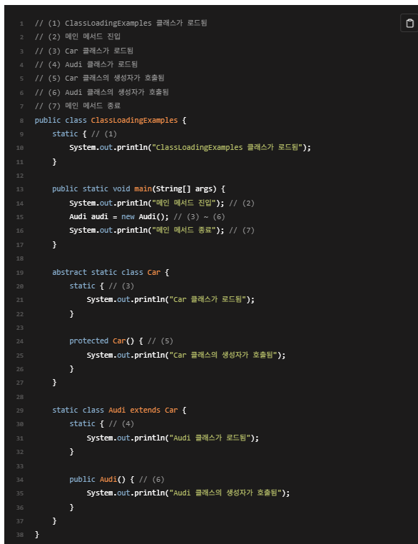 또한 부모클래스를 로딩해야 자식클래스를 로딩할 수 있다. 클래스 사용 시점에 로딩됨.