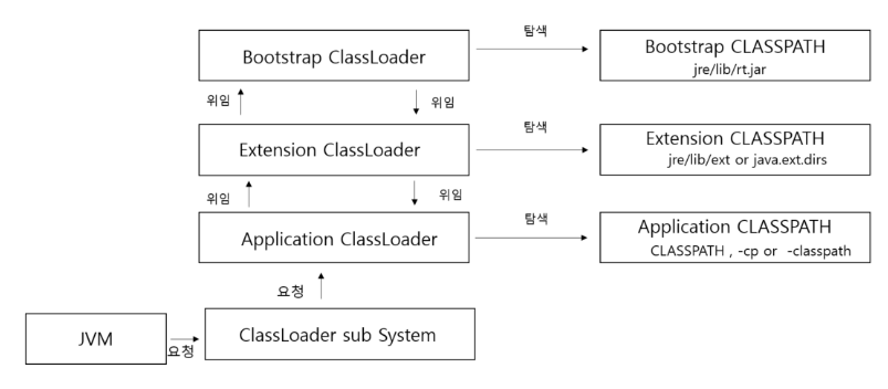 - Bootstrap ClassLoader는 rt.jar 에서 요청한 클래스를 찾은 뒤, 만약에 있으면 로딩 후 반환하고 없으면 Extension ClassLoader에게 위임한다.