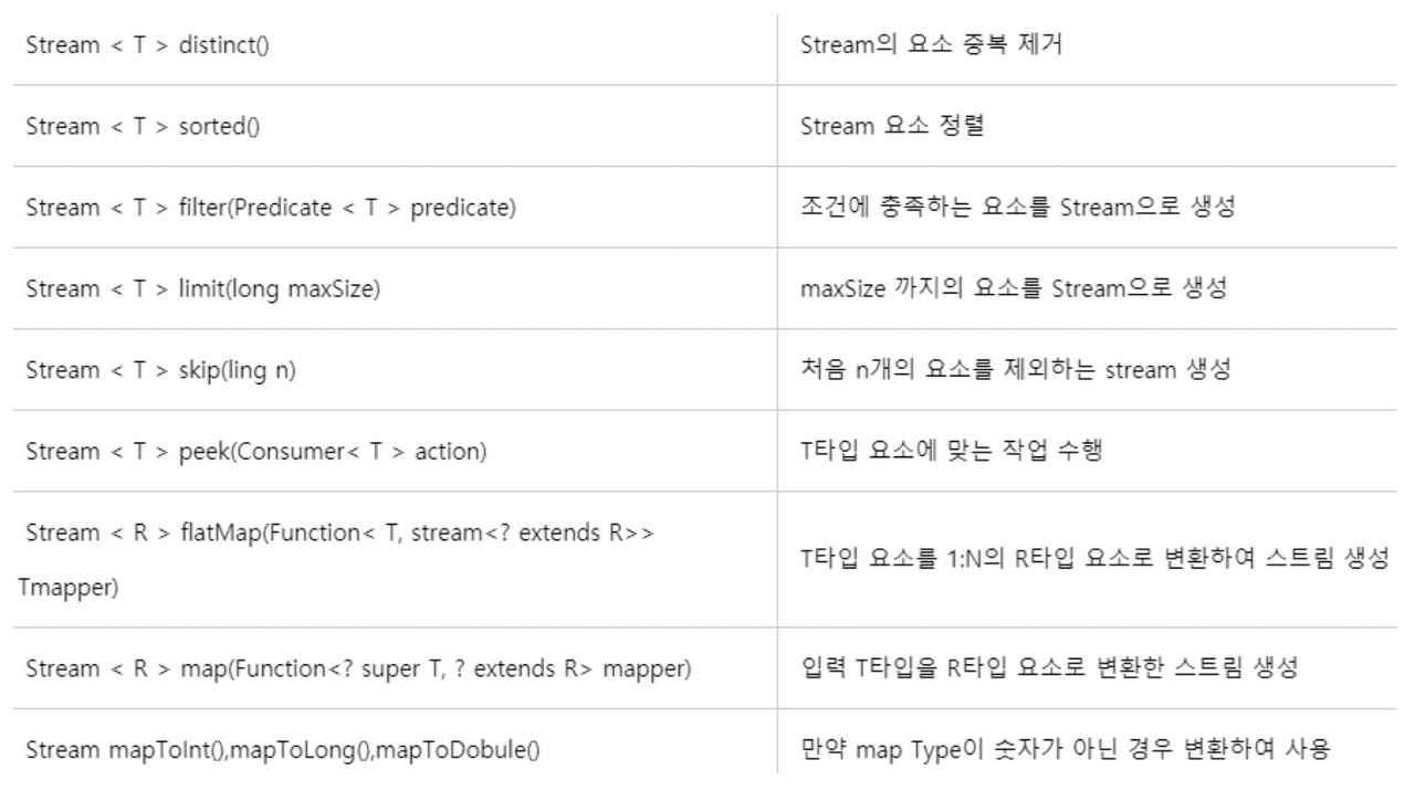 스트림은 연결할 수 있는 스트림 연산인 중간 연산(intermediate operation)과 스트림을 닫는 연산인 최종 연산(terminal operation)으로 구성된다.
