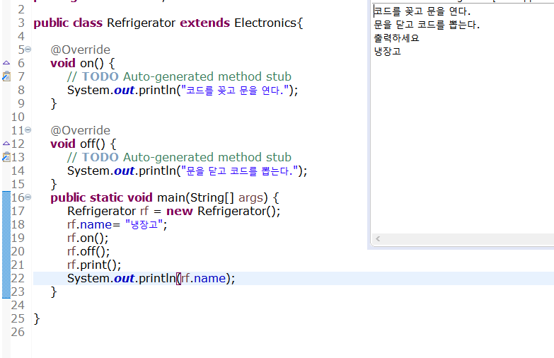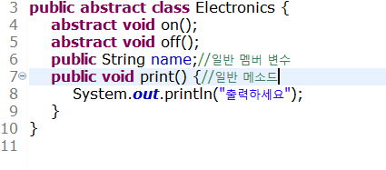 위에 코드에서 추상메소드인 on과 off는 무조건 재정의를 하여야하지만 일반 멤버 변수인 name과