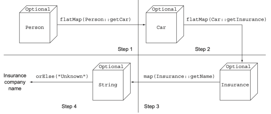 .map(optCar -> optCar.flatMap(Car::getInsurance)) // Stream<Optional<Insurance>>