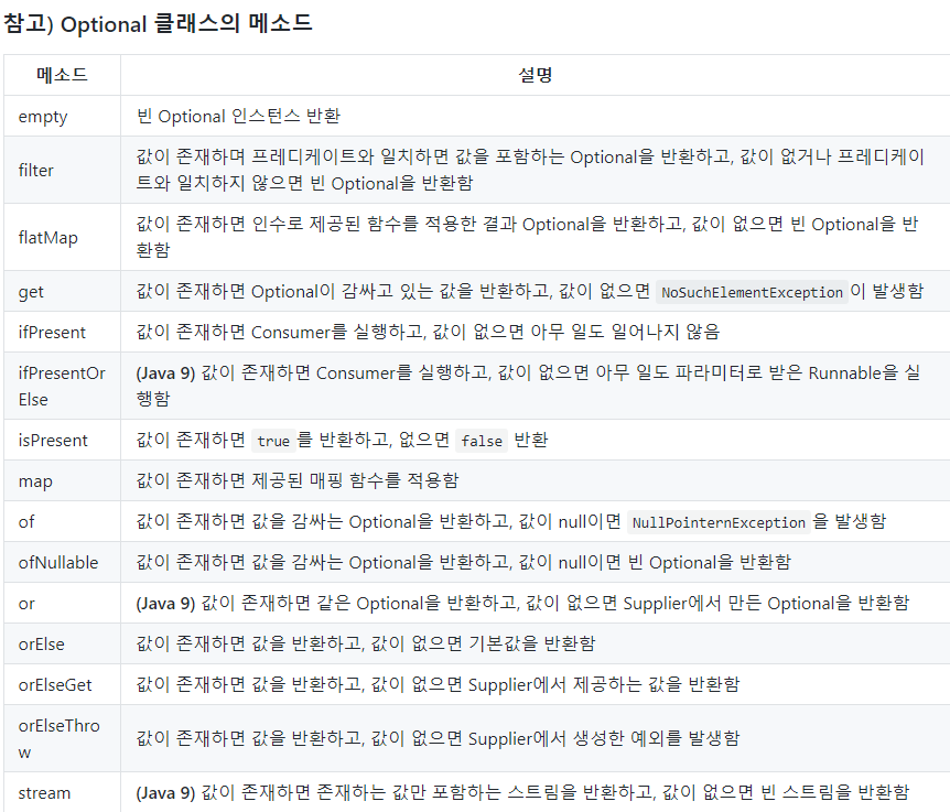※ 모든 null 참조를 Optional로 대치하는것은 바람직 하지 않다.
