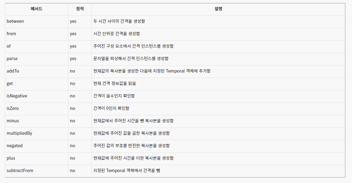 지금까지의 인터페이스는 Temporal 인터페이스를 구현한 것이다. Temporal 인터페이스는 특정 시간을 모델링하는 객체의 값을 어떻게 읽고 조작할 지 정의한다. Duration 클래스의 정적 팩토리 메서드 between으로 두 시간 객체 사이의 지속 시간을 만들 수 있다.