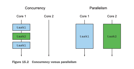 동시성 은 단일 코어 머신에서 발생할 수 있는 프로그램잉 속성으로 실행이 겹칠 수 있는 반면