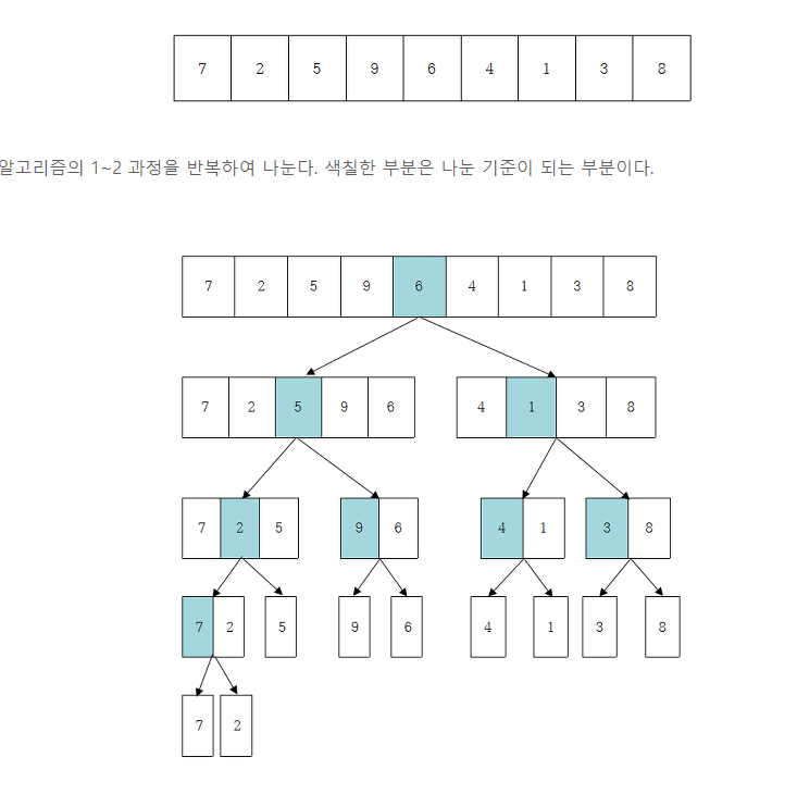 - 문제를 나눌 수 없을 때까지 나누어서 각각을 풀면서 다시 합병하여 문제의 답을 얻는 알고리즘이다.
