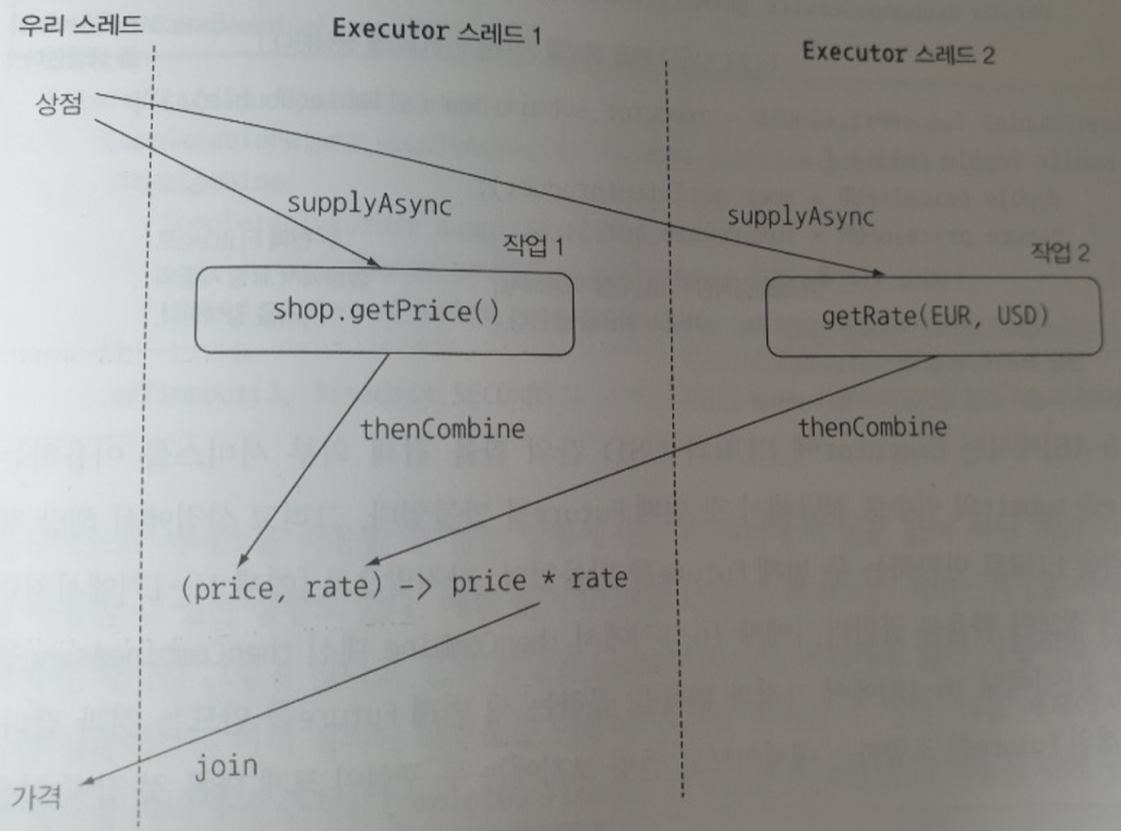 thenCompose()가 여러 개의 CompletableFuture를 순차적으로 처리되도록 만들었다면, thenCombine()는 여러 CompletableFuture를 병렬로 처리되도록 만든다.