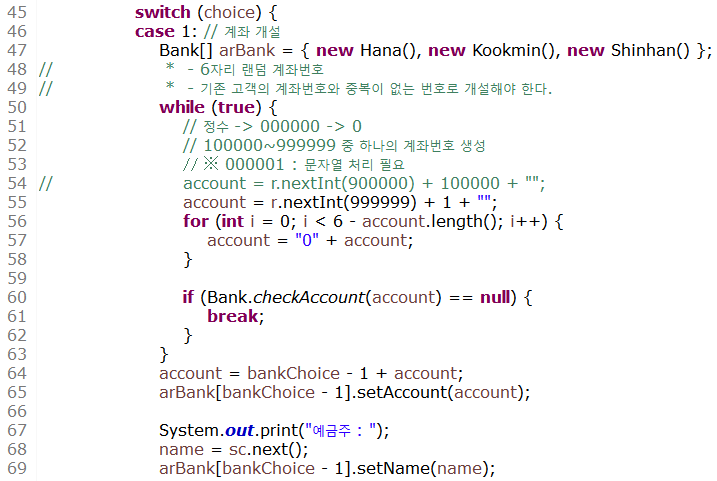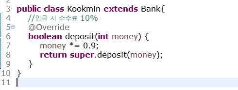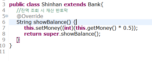 그리구 나서 은행마다 Bank클래스를 extends 하였고 각각의 성격들을 Bank클래스의 메소드를 overriding하여서