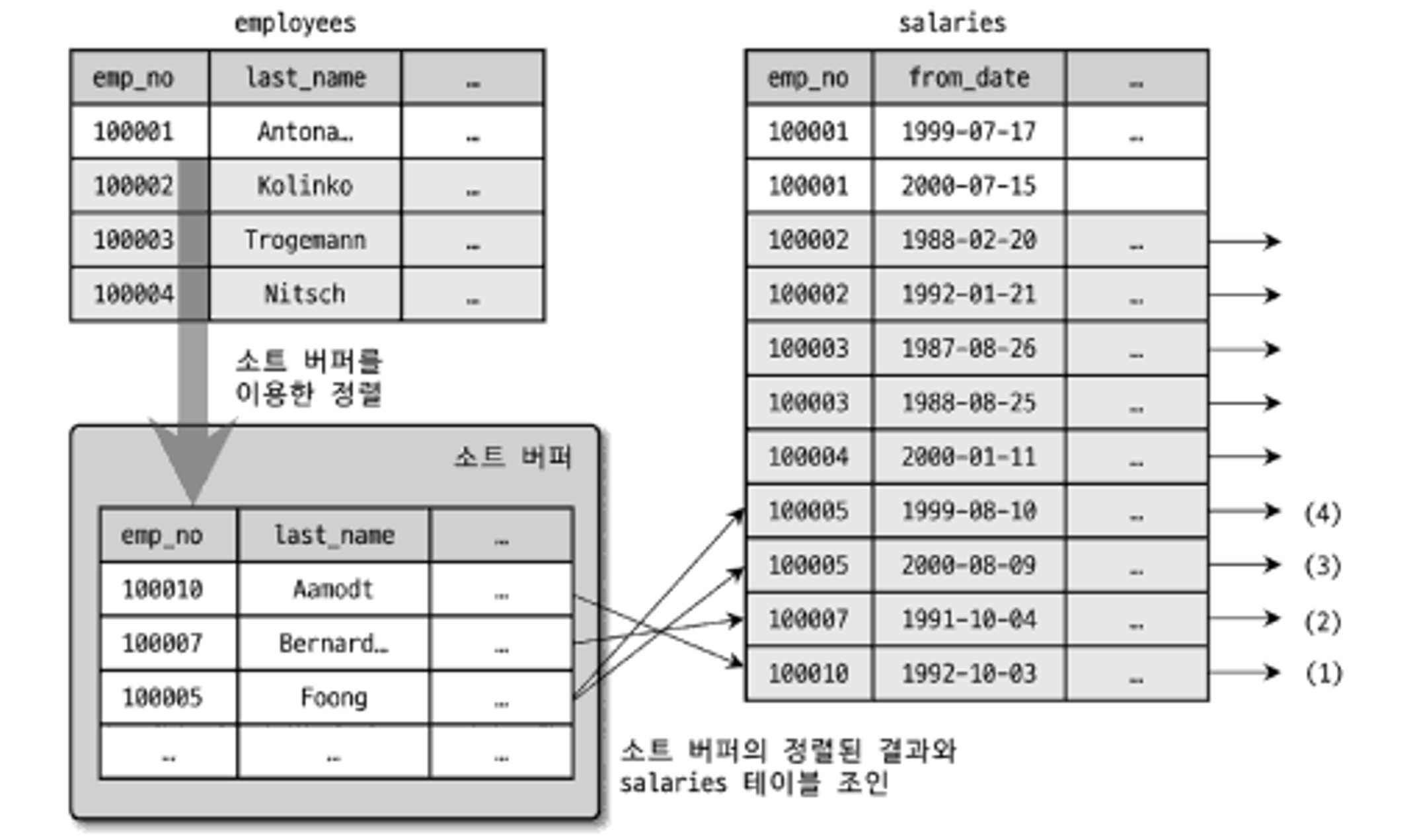 - 드라이빙 테이블의 칼럼만 order by의 조건으로 있어야 한다. 먼저 드라이빙 테이블 기준으로 레코드를 소트 버퍼에 보관 후, 소트 버퍼를 드라이빙 테이블의 칼럼으로 정렬한다. 그리고 드리븐 테이블을 드라이븐 테이블에 조인한다.