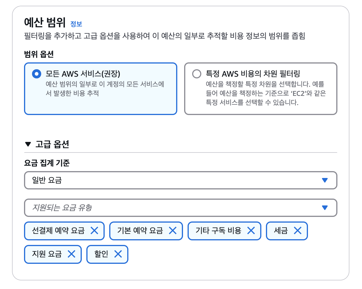 예산 범위는 모든 서비스, 고급 옵션은 기본 설정합니다.