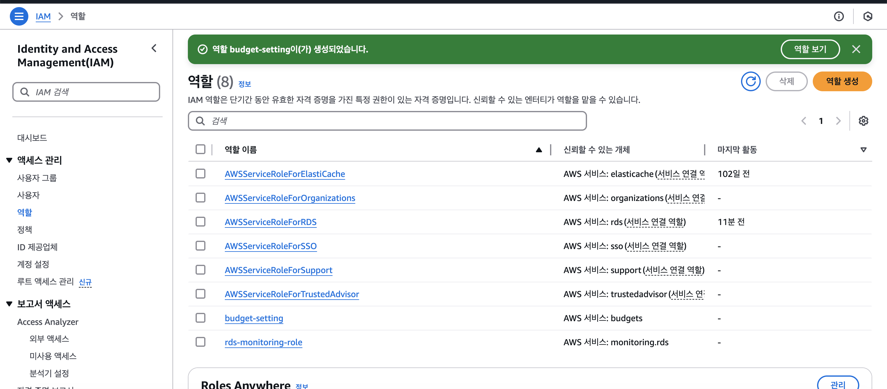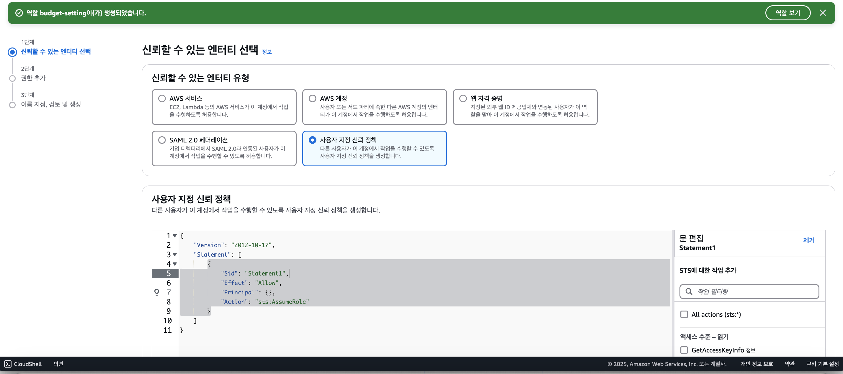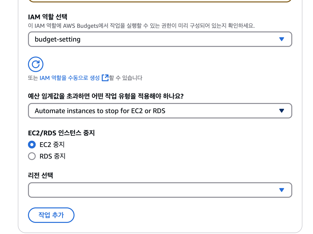 이렇게 생성하면 IAM Budget롤이 생성되고, Budget에서 인스턴스 셧다운을 할 수 있게됩니다.
