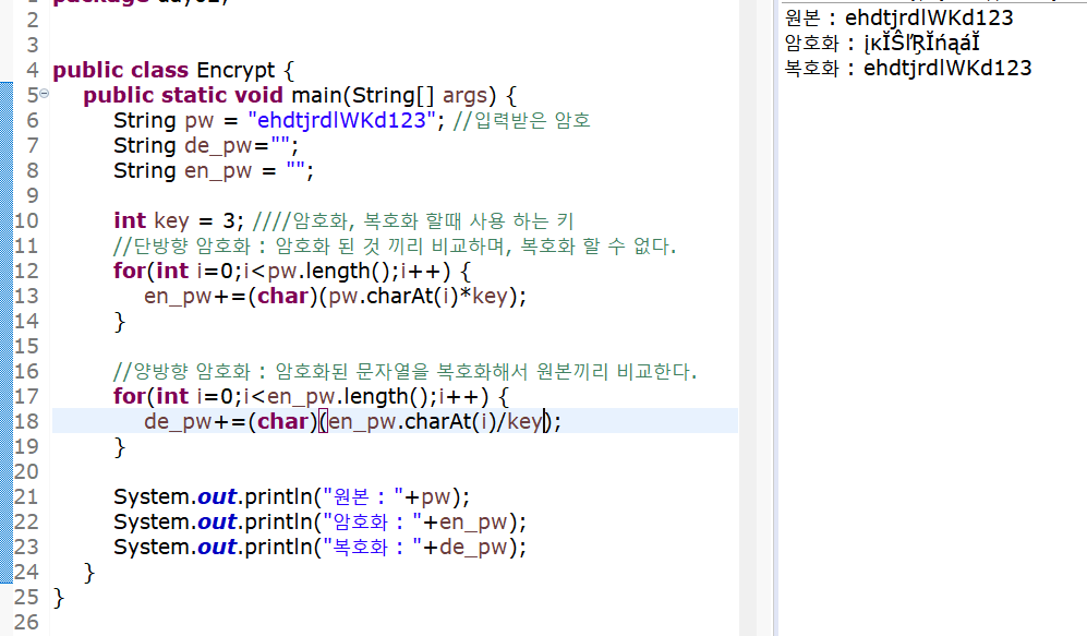 //양방향 암호화 : 암호화된 문자열을 복호화해서 원본끼리 비교합니다.