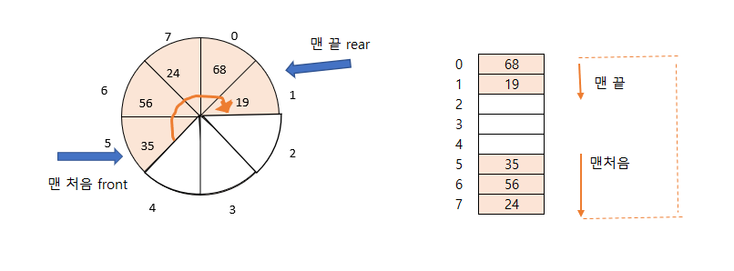 5개의 데이터(35, 56, 24, 68, 19)가 차례대로 que[5], que[6], que[7], que[0], que[1] 에 저장됩니다.