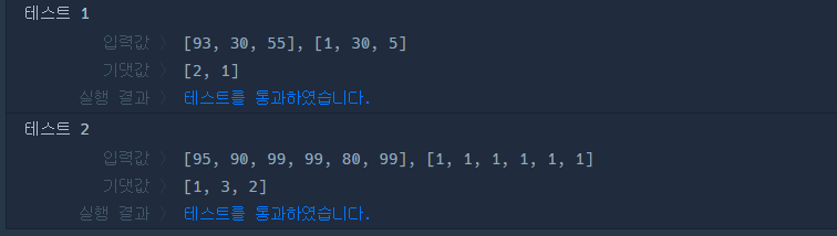 - 작업의 개수(progresses, speeds배열의 길이)는 100개 이하입니다.