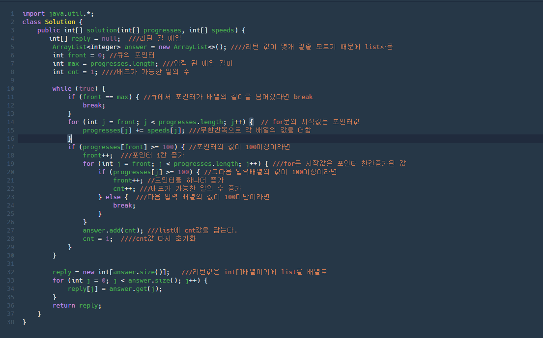 for (int j = front; j < progresses.length; j++) { ///for문 시작값은 포인터 한칸증가된 값