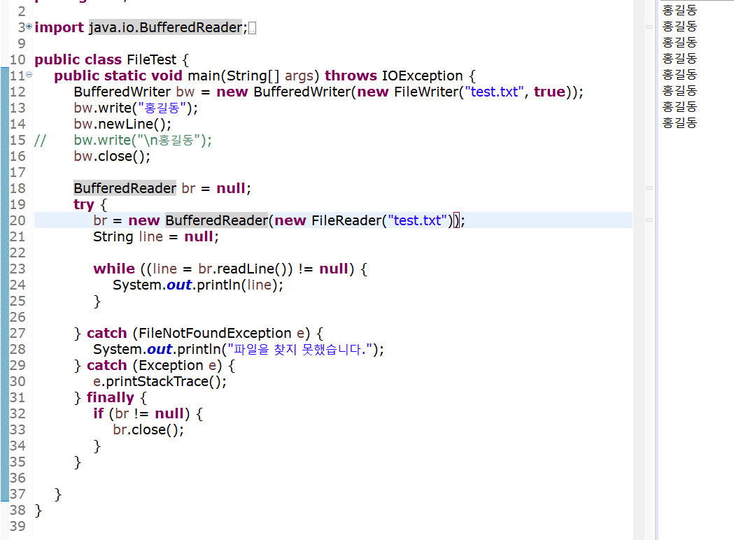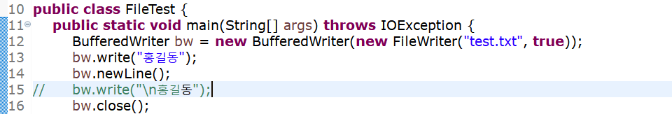 그리고 BufferedWriter 객체를 선언해 주면 try, catch문을 사용하거나 throws를 선언하여 예외처리를 해 주어야 합니다.