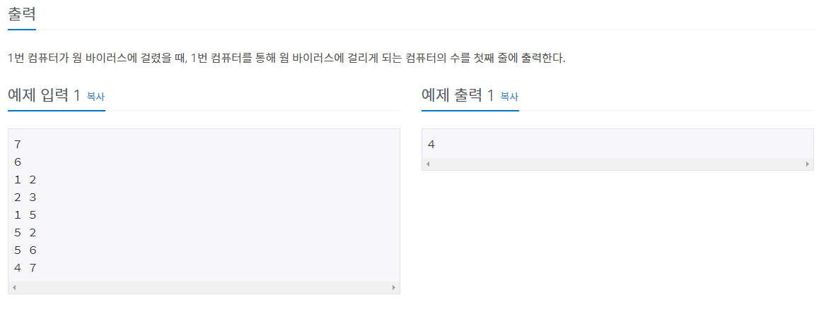 어느 날 1번 컴퓨터가 웜 바이러스에 걸렸다. 컴퓨터의 수와 네트워크 상에서 서로 연결되어 있는 정보가 주어질 때, 1번 컴퓨터를 통해 웜 바이러스에 걸리게 되는 컴퓨터의 수를 출력하는 프로그램을 작성하시오.