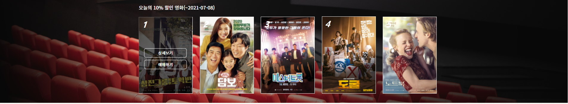 오늘의 할인 영화부분에 마우스르 가져다 놓으면 상세보기/예매를 할수 있게끔 바뀝니다.