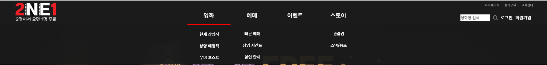 메뉴(영화 / 예매 / 이벤트 / 스토어) 부분에 마우스를 가져다 놓으면 저렇게 서브메뉴들이 열리게 됩니다.