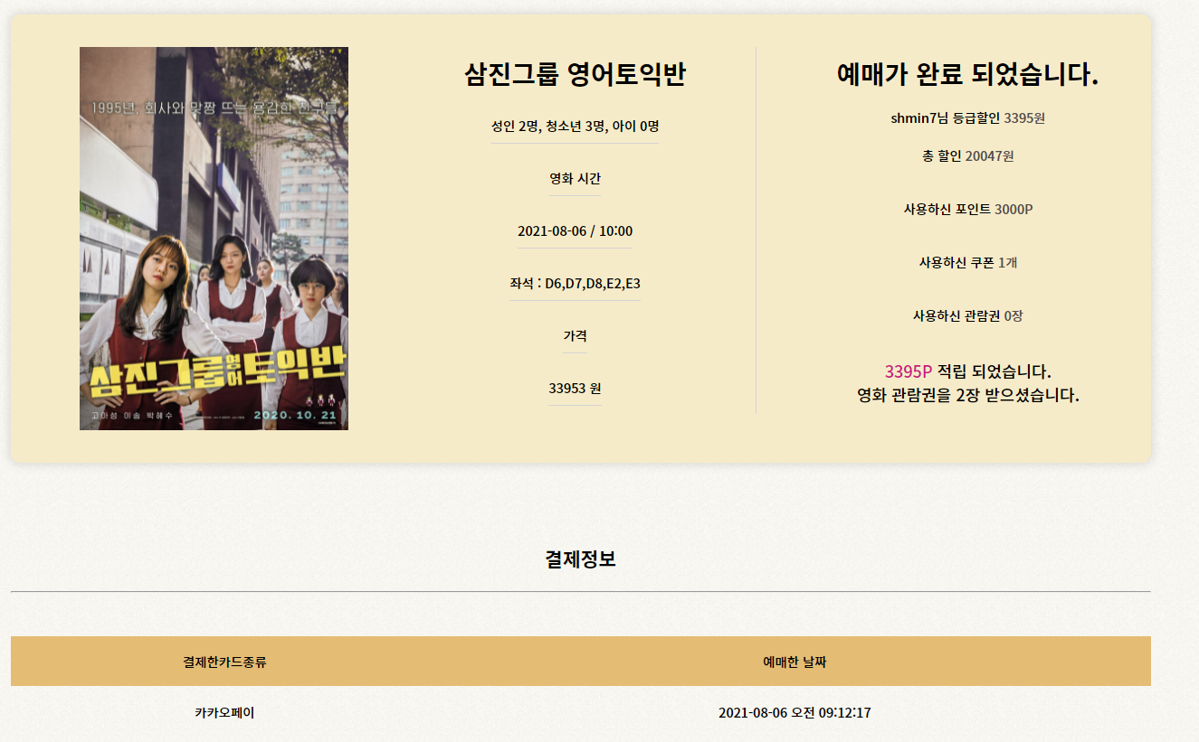 할인 받은 금액, 쿠폰, 포인트와 적립받은 포인트, 받은 관람권등 결제정보가 나오게 됩니다.