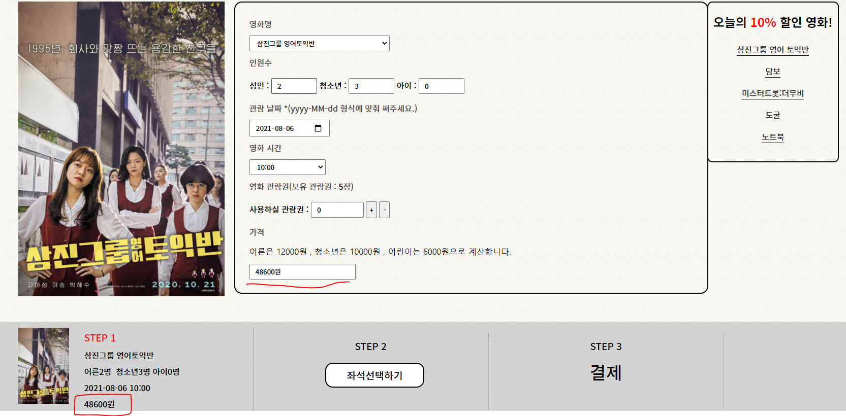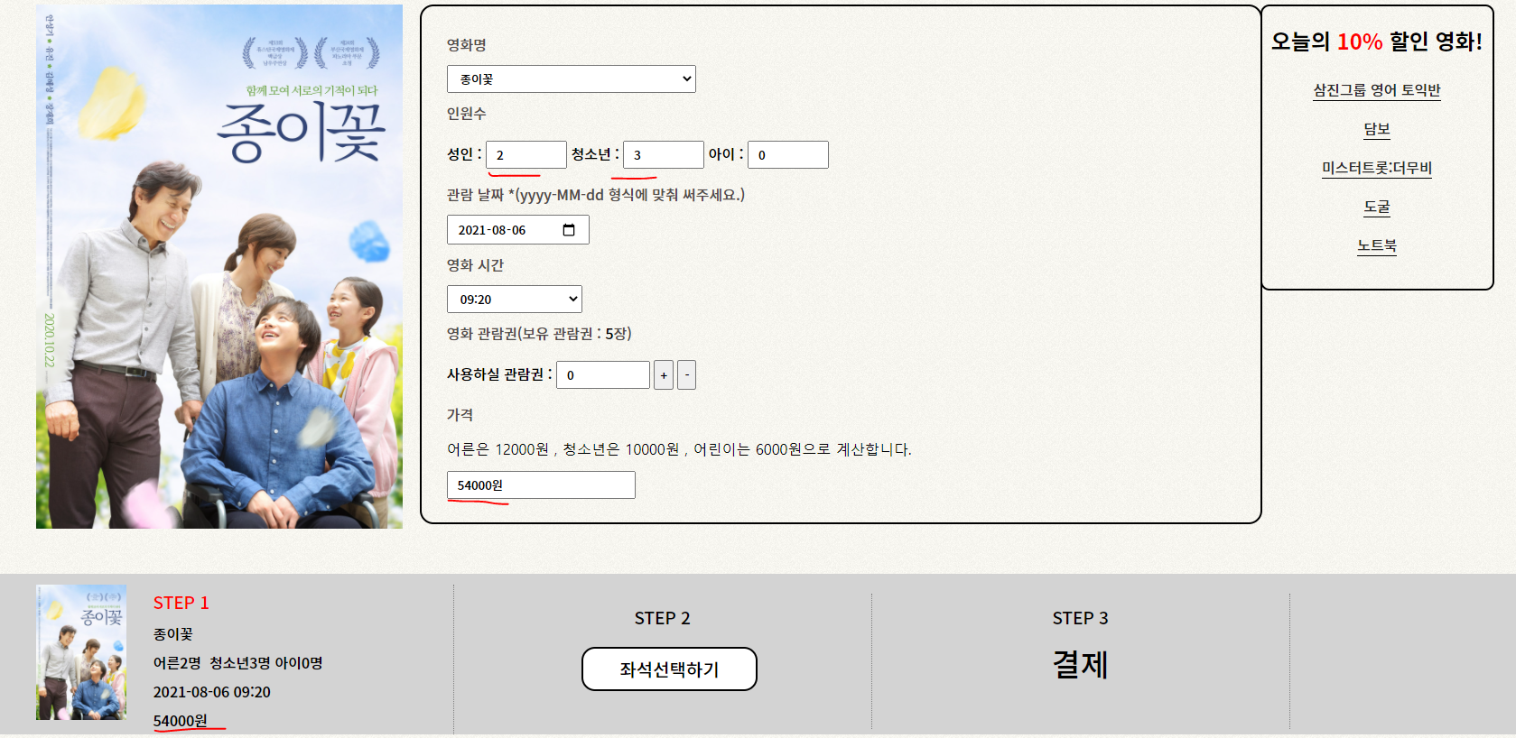 4. 오늘의 10%할인 영화는 다른 영화보다 10%추가로 할인이 됩니다.