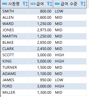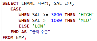-- EMP 테이블에서 SAL 3000이상이면 HIGH, 1000이상이면 MID, 다 아니면 LOW