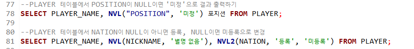 NVL(컬럼명, '값') : NULL 값 대신 다른 값으로 변경 후 검색합니다.