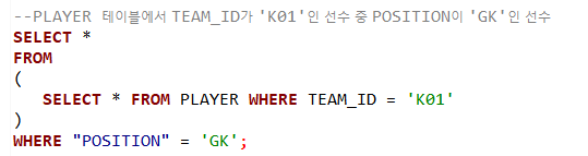 --SELECT문에 SELECT를 한번 더 써서 사용하는 SQL문인데요, SELECT를 어디에 쓰는지에 따라 명칭이 달라집니다.