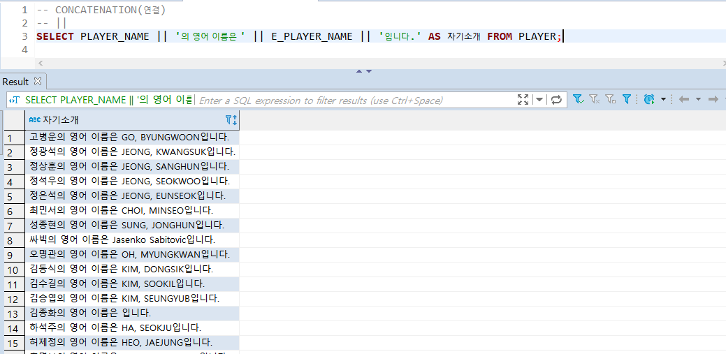 SELECT PLAYER_NAME || '의 영어 이름은 ' || E_PLAYER_NAME || '입니다.' AS 자기소개 FROM PLAYER;