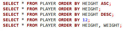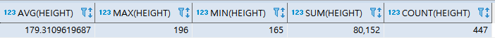 SELECT AVG(HEIGHT), MAX(HEIGHT), MIN(HEIGHT), SUM(HEIGHT), COUNT(HEIGHT) FROM PLAYER;