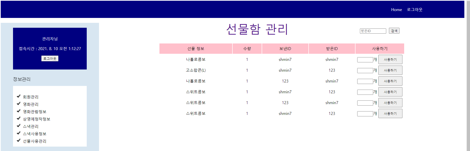 영화 예매권이나 스낵같은 경우에는 홈페이지에서 일반 사용자가 직접 사용을 하지 못하고,